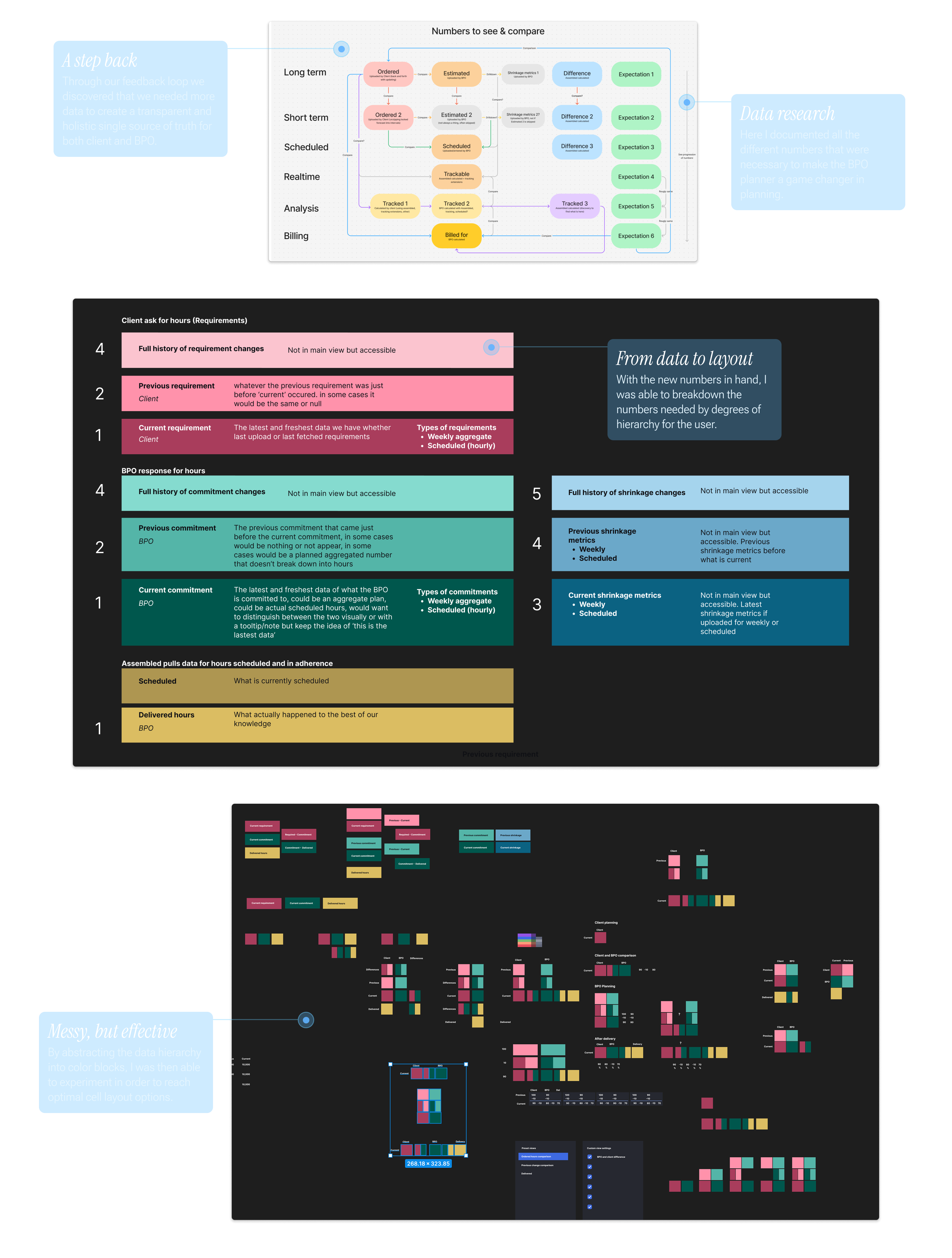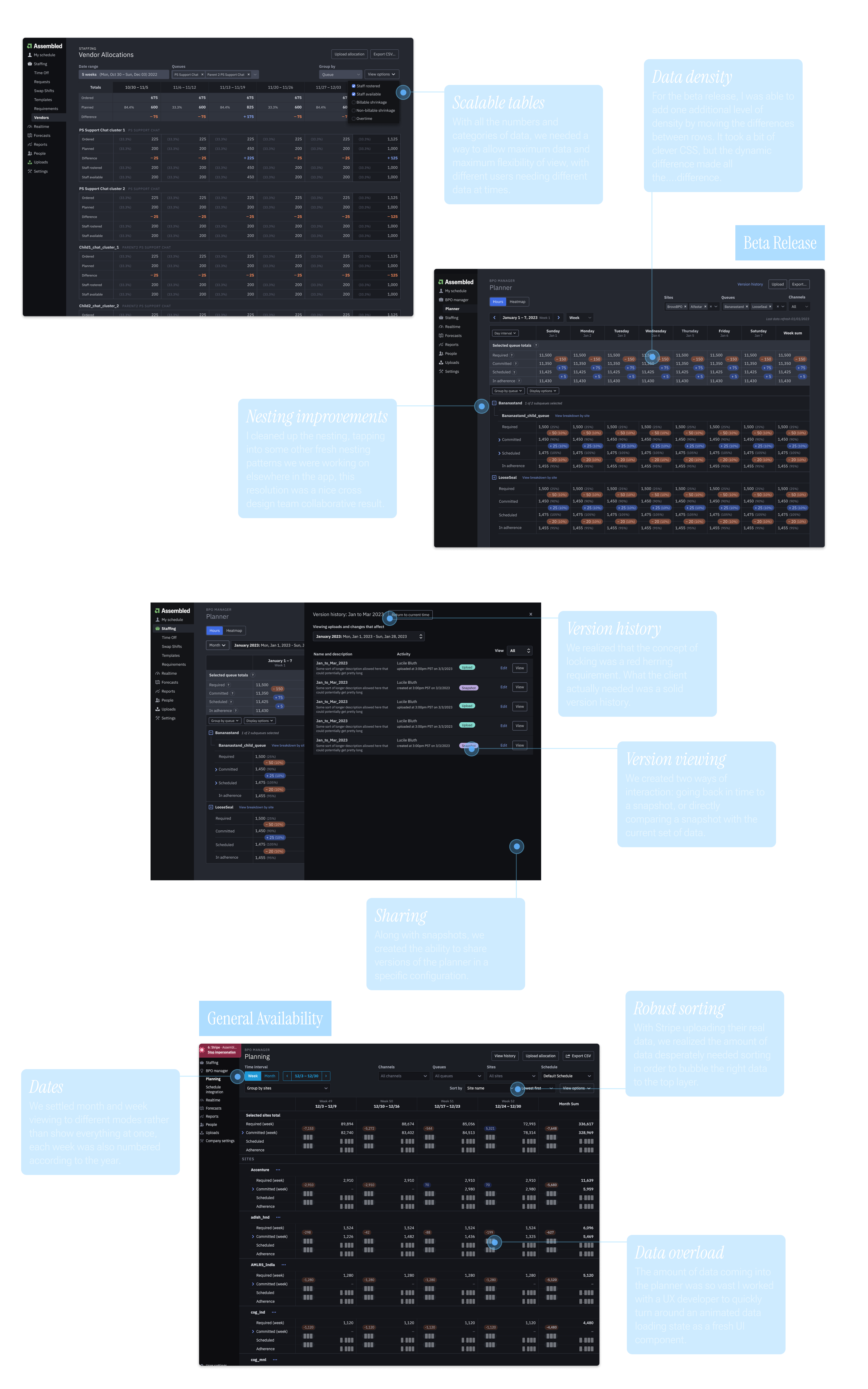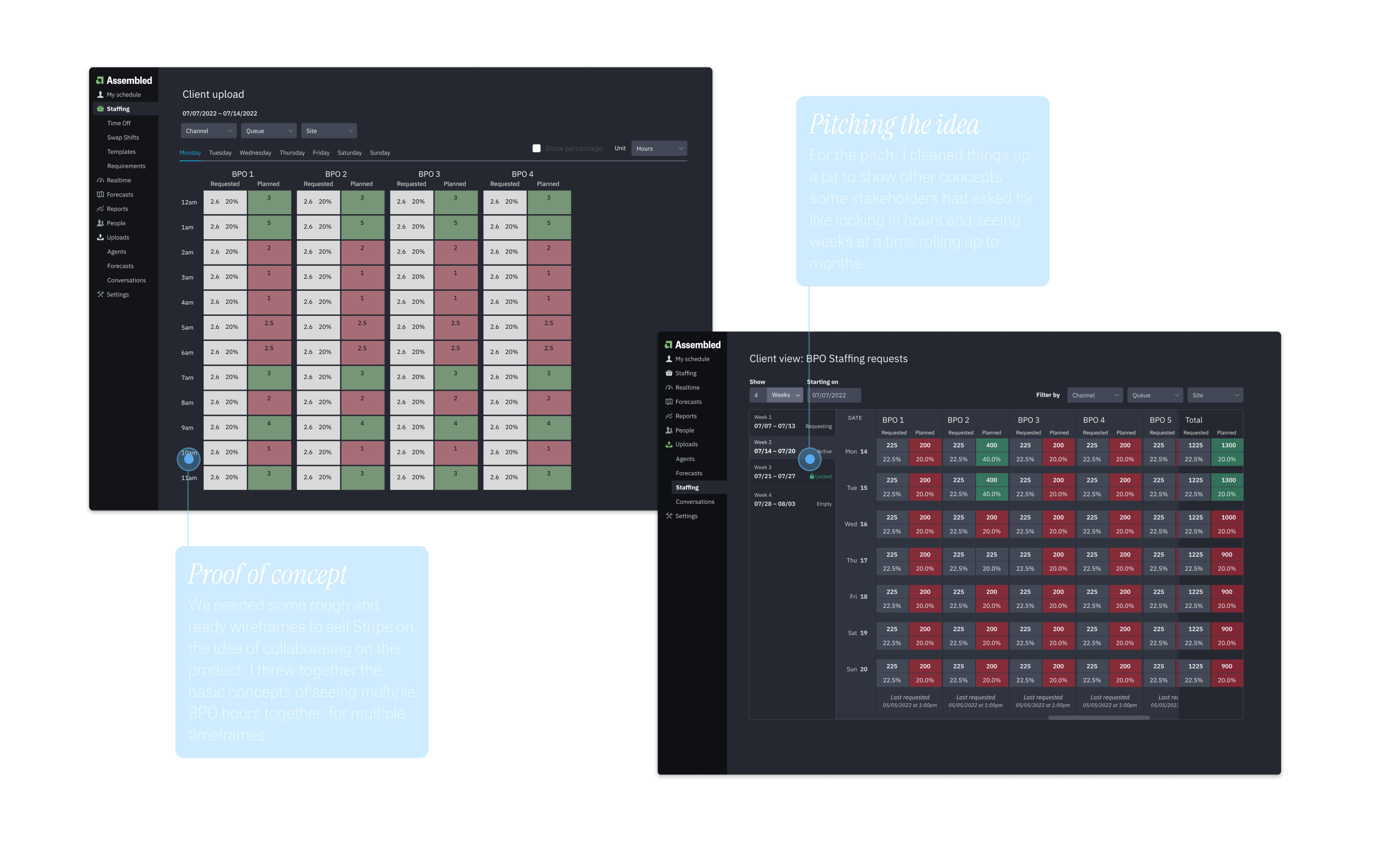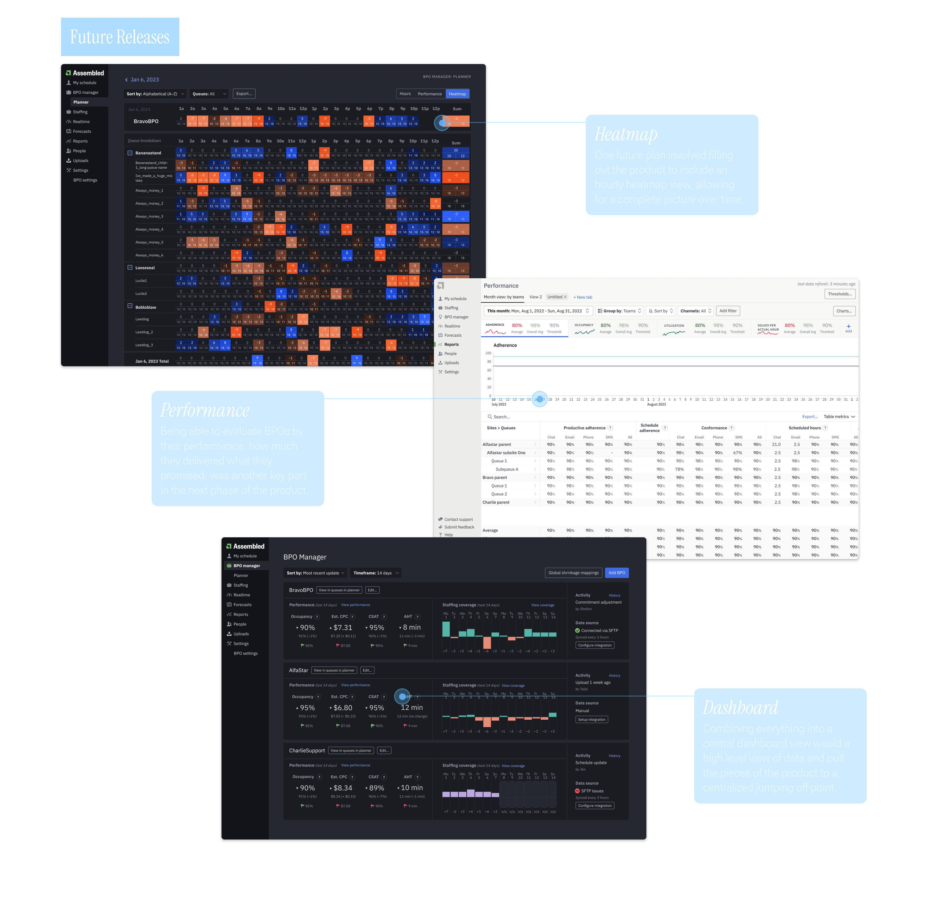 I served as the design lead for the ideation, design, and launch of Assembled’s first expansion product: management tooling for Business Process Outsourcing (BPOs), essentially third party providers. This product was the first of it’s kind in the workforce management space. It tackled problems competitors did not, and allowed Assembled to maintain existing clients, sell to new ones, and compete on an enterprise level.